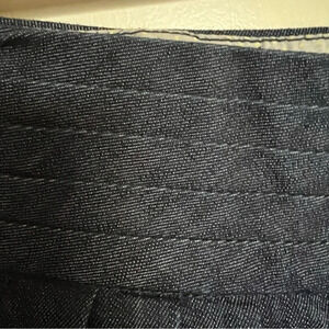 Dark wash denim skirt featuring six buttons down the front and side pockets. High waisted with some pleating.