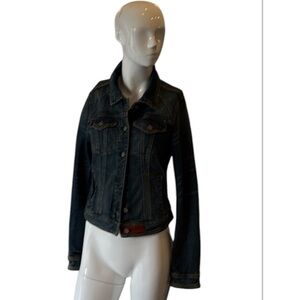 Classic distressed dark wash denim jacket with buttoned breast pockets, side pockets and hidden patch pockets on the inside.