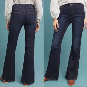 Pilcro and the Letterpress High Rise Bootcut Jeans in Dark Wash. Size 29. Button hem detailing.