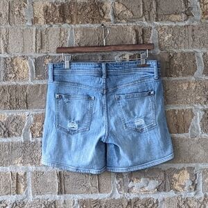 Great preowned condition Hyphen stretch denim jean shorts from Pilcro and the Letterpress by Anthropologie. Zipper fly and button closure. Classic 5 pocket design. Slight puckering near fly (pictured). Factory distressed.