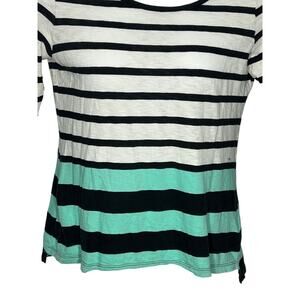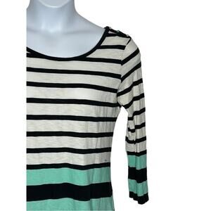 This Anthropologie Pilcro and the Letterpress striped t-shirt is in excellent preowned condition and comes from a smoke-free home. Featuring a timeless design with white, black (or navy), and green stripes, this 100% cotton tee offers comfort and style for everyday wear. Decorative snaps on one shoulder add a unique touch to this classic casual top.