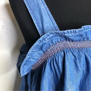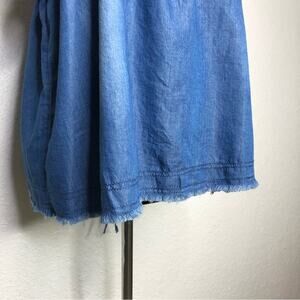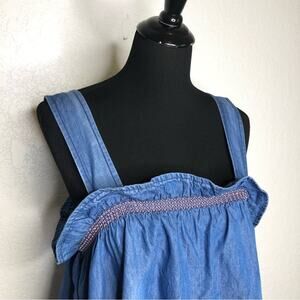 Anthropologie Pilcro blue denim chambray ruffle neckline sleeveless top. Pullover style with square neckline. Wide shoulder straps that button in back. Ruffled neckline. Raw hem. Ties down the back. Size Extra Large XL. Excellent preowned condition. Some faded spots that are part of original design