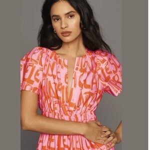 This elegant pink sundress from Anthropologie features a ruffled, tiered design perfect for wedding guest occasions. The dress boasts a classic crew neck and flutter sleeves, adding a playful touch to its sophisticated silhouette. Its flowing maxi length ensures a graceful appearance, ideal for any special event.