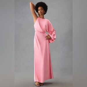 Anthropologie Pink One Shoulder Bishop Sleeve Floor Length Bridesmaid Dress