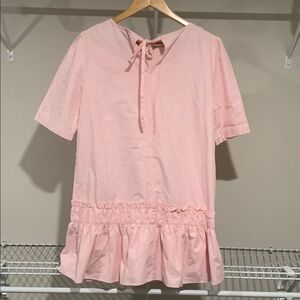 Chic pink short sleeve dress with a gathered waist. Perfect for casual outings.