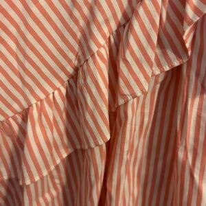 Elegant pink striped maxi skirt. Features a wrap design with ruffle details. Perfect for a chic look.