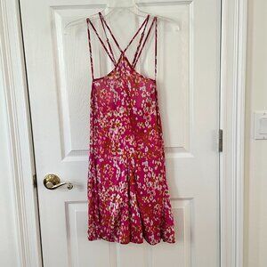 Stylish backless dress with pink and orange floral pattern. Features delicate straps for a chic look.