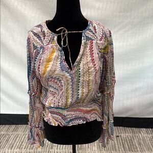 Anthropologie Pink and Purple Smocked Tie Front Blouse