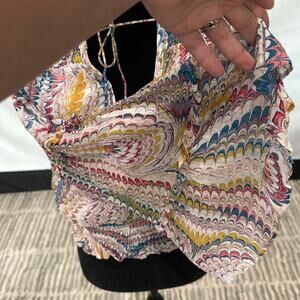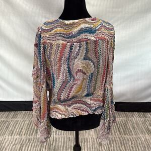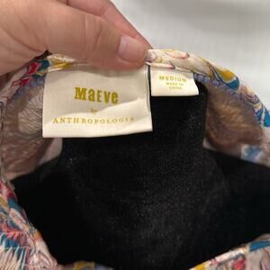 This elegant long-sleeved blouse from Anthropologie features a smocked design with a charming tie front. The vibrant pink and purple hues create a captivating look, while the flowing fabric adds a touch of bohemian flair. Perfect for adding a pop of color to any outfit, this blouse is both stylish and versatile.