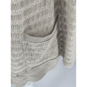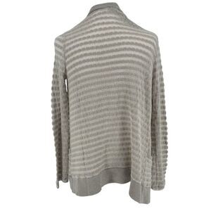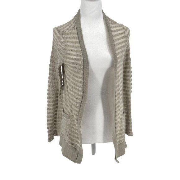 Add a touch of effortless style with this lovely Anthropologie Pleione Cotton Blend Cardigan Sweater! This lightweight piece features a subtle ribbed texture with a neutral taupe and cream striped pattern, crafted from a comfortable cotton blend. The open-front design and relaxed fit make it perfect for layering over dresses, tees, or blouses for a chic casual look or a cozy office ensemble!