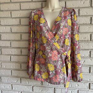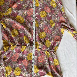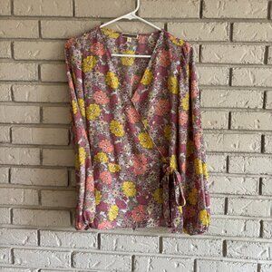 Anthropologie Pleione Pink Floral Faux Wrap with Bow Boho Blouse Medium. Good condition there are no stains tears or holes. See photos for measurements.