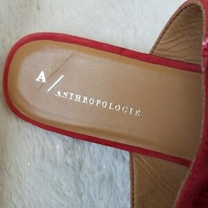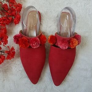 NWOT, red suede, pointed toe, slide ons, pom-pom detail, mules,size 41.
