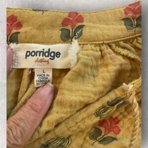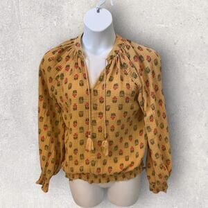 Boho-chic Anthropologie Porridge “Elizabeth” blouse in size Large. This lightweight 100% cotton peasant top features a gathered neckline with tasseled ties, ruched shoulders, and a smocked waist and cuffs. The cheerful mustard yellow base with red floral print gives it a playful, vintage-inspired vibe. Perfect with denim or linen!