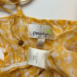 This yellow Porridge Lobster Print Maxi Dress from Anthropologie in golden yellow and white boho nautical lobster print features a gorgeous long maxi silhouette with a babydoll empire waist, tiered flounce ruffled hem, a crossover surplice v-neckline, and adjustable spaghetti straps with a tie back detail at back.