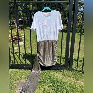 Gorgeous anthro porridge metallic twofer mini dress. Never been worn, with tags attached. Polyester skirt; cotton top; polyester, elastane lining