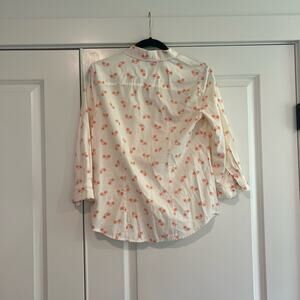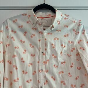 All orders ship within 1-3 business days. This women's button up is made by Anthropologie Postage Stamp. Color is white with an orange bike pattern. Size is 4. Excellent condition. Fabric is cotton. Make me an offer! Although clothing is not visibly soiled we recommend washing all preloved items before wear.
