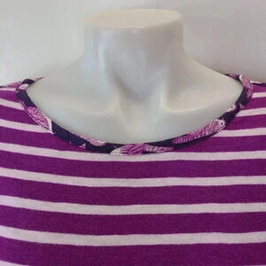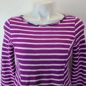 Anthropologie Postmark Mixed Media Cotton Rayon Purple Striped Bird Print Hi Lo Ruffle Top XS. Purple and lavendar stripes with purple bird print. Mixed Media, the top is 100% cotton and bottom ruffle is 100% rayon. 3/4 sleeves with small printed fabric covered button detail. Seam detail with raw edge on the front and seam detail on the back. The bottom print ruffle has front pockets and a hi lo hem. In very good preowned condition. Fun, boho style. Perfect colors and style for Spring.