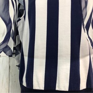 Navy blue and white, window pane/stripes, sheer nylon poncho/cape over a stripe knit tank top, ribbed trim at waist, one button closure on back with keyhole, colors may vary due to lighting, good used condition, Sz: S