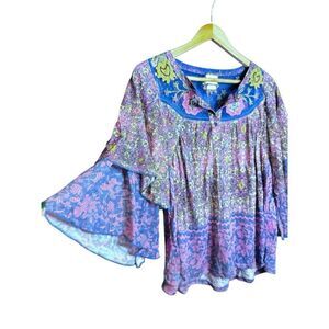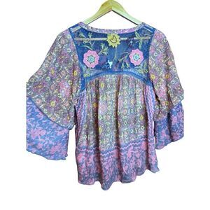 Pink Postmark Floral Cross Stitched Anthropology Embroidered Ruffle Blouse M.