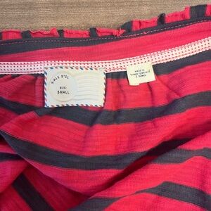 Striped Henley top with floral trim. 3/4 length sleeves, button-front placket, pocket at the chest.