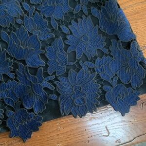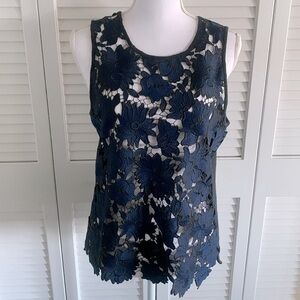A gorgeous tank top from Anthropologie brand, Postmark. The unlined front of navy blue and black embroidered lace would look great with a black bra and blazer, or a camisole. A bit of stretch in the fabric provides a great fit. Gently worn and in great condition. Keyhole button closure in back. Women’s size medium.