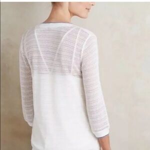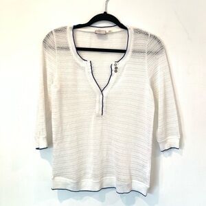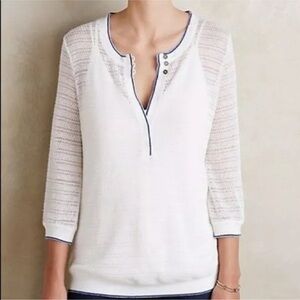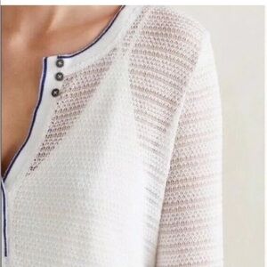 Anthropologie Postmark open knit white sweater with keyhole and three buttons. Blue trim.