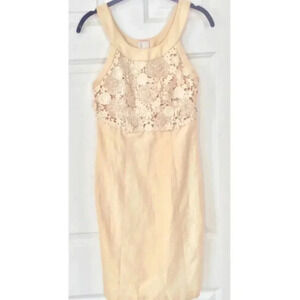 Cute and chic Anthropologie Postmark "Oleander" dress. Beautiful cream-colored canvas sheath dress with an openwork crochet floral lace detail across the chest, with a back kick pleat and full lining.