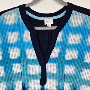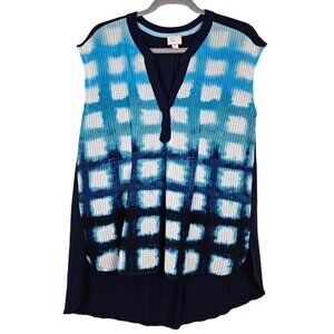 Anthropologie/Anthro Postmark Split Neck Blouse, size M. Style# OB398626. Split V-neck, popover style, sleeveless/cap sleeves, high/low hem, mixed media fabric, stretch knit back panel, front panel semi-sheer ombre abstract windowpane plaid print. Excellent pre-owned condition.
