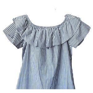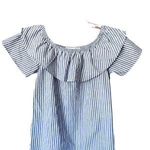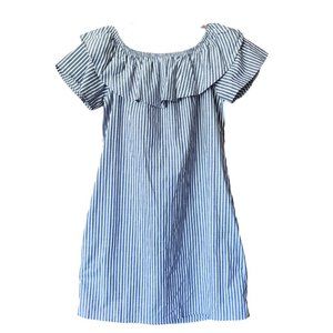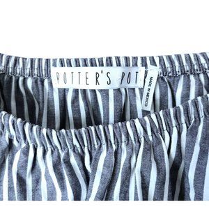 Potter’s Pot blue and white striped dress; short sleeves; round neckline; 97% cotton, 3% spandex.