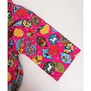 The Anthropologie Print Fresh Xmas Ornaments Organic Cotton Long Belted Robe in size S/M is a festive and stylish addition to your holiday wardrobe. Made from hot pink organic cotton, this robe features a overall print of bright colorful holiday ornaments in non traditional patterns, 3/4 sleeves, a V-neckline, and a belted tie in a contrast print of dark green and blue floral and horses. The belted design adds a flattering element to the kimono-style robe, making it perfect for lounging around the house during the Christmas season. Easy to care for with machine washable instructions, this robe combines comfort and style effortlessly. Pre owned excellent condition, no stains rips or odors, robe does not look to have been worn. the belt may be a replacement as the print is not the same but the contrast looks good with the robe and is the same brand.