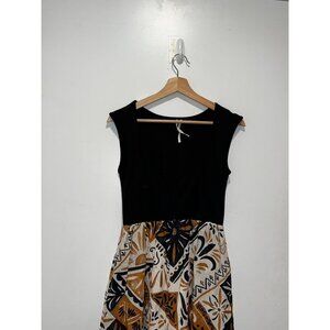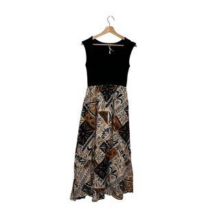A stylish sleeveless maxi dress featuring a black bodice and geometric-patterned skirt. Comfortable cotton blend material for a chic yet relaxed fit.
