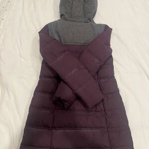 Stylish purple puffer coat with toggle closures. Features a cozy hood and side pockets. Perfect for cold weather.