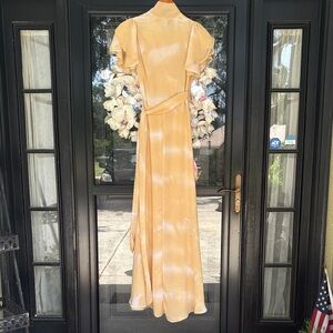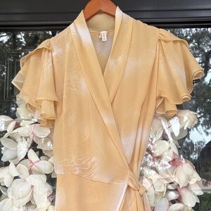 This gorgeous Anthropologie Raga Dress is a flowy wrap-closure dress in a light fabric with a subtle sheen in a muted pattern. It has a v-neckline and is versatile with the waist tie. She is 63” long from shoulder to bottom hem. 16” PTP. She’s stunning!