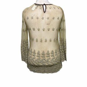 Women's Ryu Embroidered Floral Top in a size Small. The color is green umber (creamy color with green undertone) and has a contrasting brown satin collar band with keyhole back closure. The embroidery is small flowers all over and features a scalloped bottom hem and at the end of the bell sleeves. The material is a completely sheer mesh.