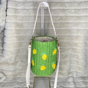 Anthropologie Raffia Green Woven Bucket Bag with Lemon Fruit Embroidery