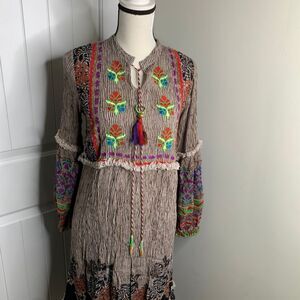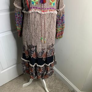 Stunning boho maxi dress featuring intricate embroidered floral designs and colorful tassels. Crinkled fabric with beautiful balloon sleeves and tiered skirt. Detailed with vibrant embroidery on bodice and sleeves. Perfect for festivals, summer events, beach vacations, or bohemian-inspired occasions. In excellent condition with all embellishments intact, size small.