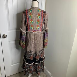 Anthropologie Raga Boho Embroidered Maxi Dress Peasant Floral Tassel Cottagecore