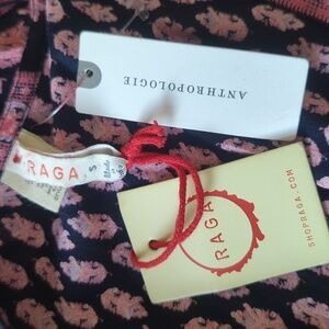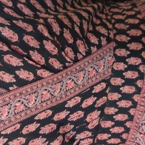 Pullover style. Elastic waistband at back, front smooth panel. Allover geometric print. 2 front slits. Navy Blue Background with Pink. New with tags
