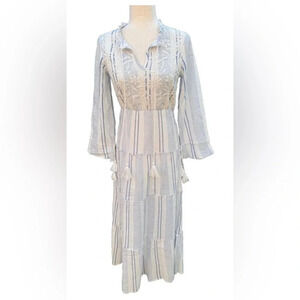 NWT Anthropologie Raga Tiered Boho Maxi Dress, embroidery detail on front bodice, ruffled detail at collar, tie with tassels at neck and sleeves, elastic waist, 16” PTP, 53” length, 100% cotton, brand new condition, smoke free home