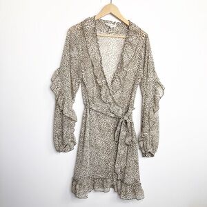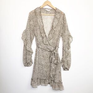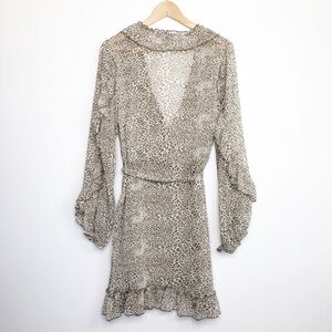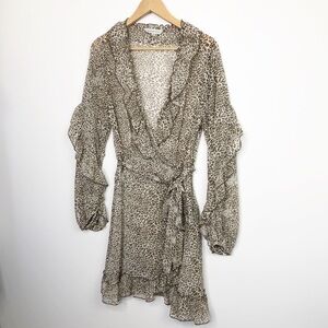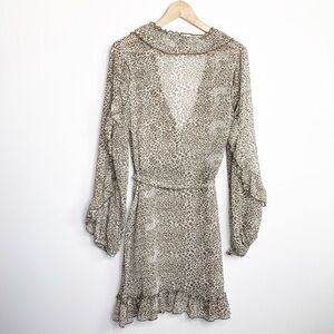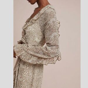 Anthropologie Ranna Gill ruffled leopard print dress, with faux wrap and ties at the waist.
