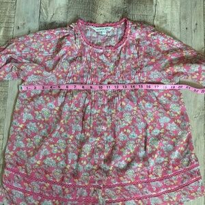 Anthropologie Ranna Gill pink, yellow and blue floral boho chiffon blouse top with feminine details- pintuck front and back chest and along sleeves, crochet lace trim at neckline, cuffs and above hem, vertical ladder stitch detail at chest and back between pintucks. Button front closure. 2 button closure at cuffs. Wide, loose fit sleeves. Flowey boho babydoll fit. Lightweight chiffon fabric.