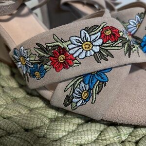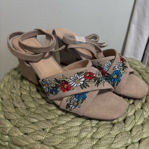 Anthropologie Raye Tan Suede Embroidered Floral Lace Up Heeled Sandals NWOB