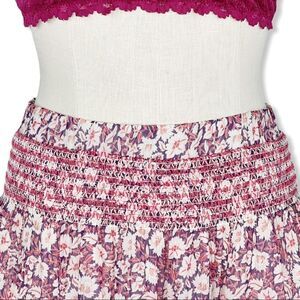 Light, flowy, all over floral print, elastic smocked waistband, 3 tiered ruffles, pull on, fully lined.