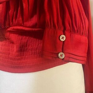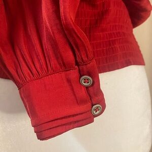 In good preowned condition. Does have some scratching marks on the fabric. See pics closely. Pullover Vneck with clasp closure. Waist tie detail.
