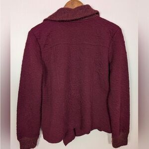 This vibrant red bomber jacket from Anthropologie combines a modern asymmetrical design with a comfortable fit. Crafted from soft materials, it offers a stylish yet relaxed look perfect for any casual outing.