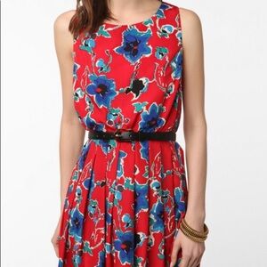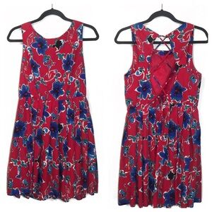 Anthropologie Red Floral Lace Up Back Pleate Dress
