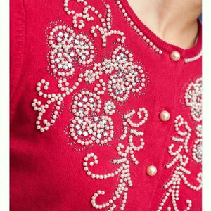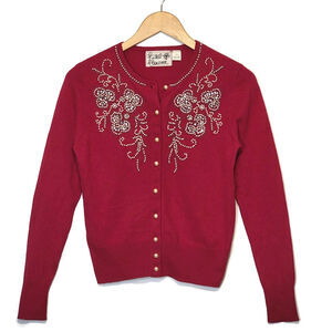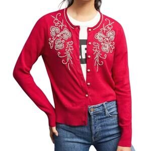Anthropologie Red Pearl Bead Cardigan Sweater Scoop Neck Holiday Festive Size XS