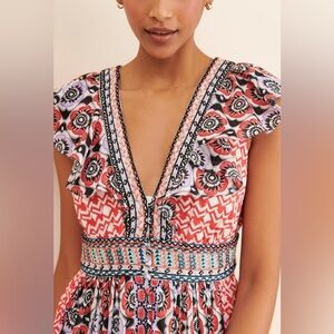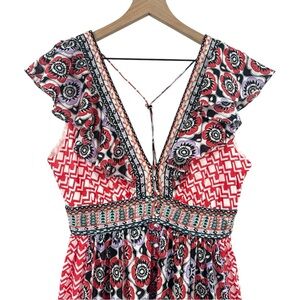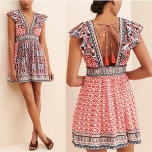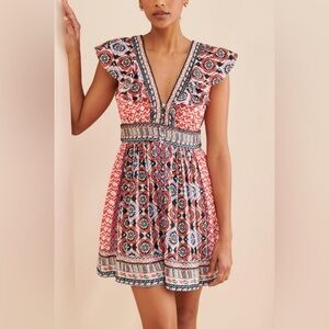 Vibrant mini dress with intricate patterns. Features a deep V-neck and flutter sleeves. Tie-back detail with tassels. Perfect for a chic look.