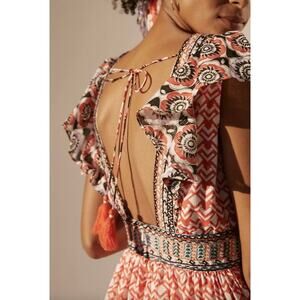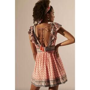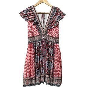 Vibrant mini dress with intricate patterns. Features flutter sleeves and a deep V-neckline. Perfect for a stylish look.
