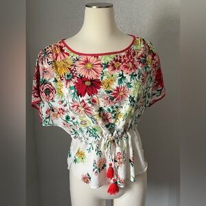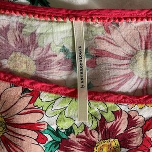 This Anthropologie blouse features a vibrant floral print with red and pink hues, perfect for a summery look. The short sleeves and tie front style add a playful touch, while the crop design offers a modern silhouette. Ideal for warm weather, this top combines style and comfort effortlessly.